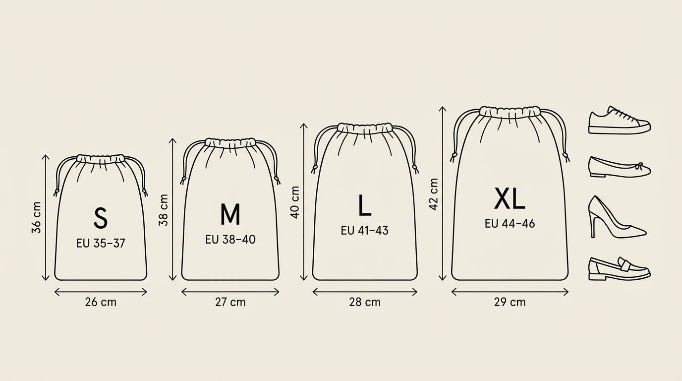 Thanks to the well-thought-out design, the bags comfortably fit heels, sneakers and everyday shoes. The soft yet durable fabric protects delicate surfaces and prevents shoes from coming into contact with clothing or other items.